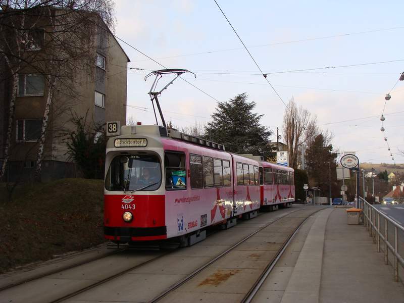 Schlüsselwörter: Linie38, 38, 4043, 1443, E2, AndenlangenLüssen, An-den-langen-Lüssen, An, den, langen, Lüssen, Grinzing, strab, straßenbahn, hochflur, TypeE2, Type-E2, beiwagen, beiwagen-c5, c5, beklebt, pink, ribbon, WiLi, WienerLinien