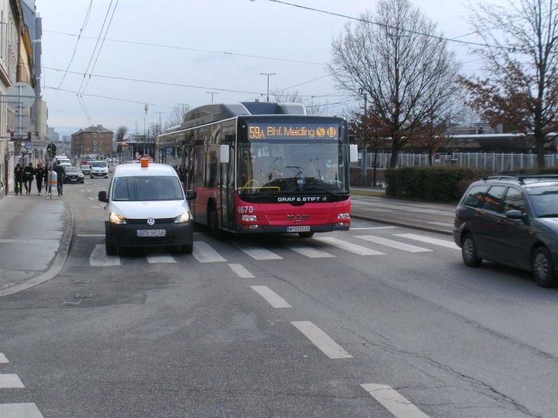 Linie 59A, auf dem Weg zur Betriebsgarage Raxstraße, nach dem Verlassen der Haltestelle Bf. Meidling Eichenstraße