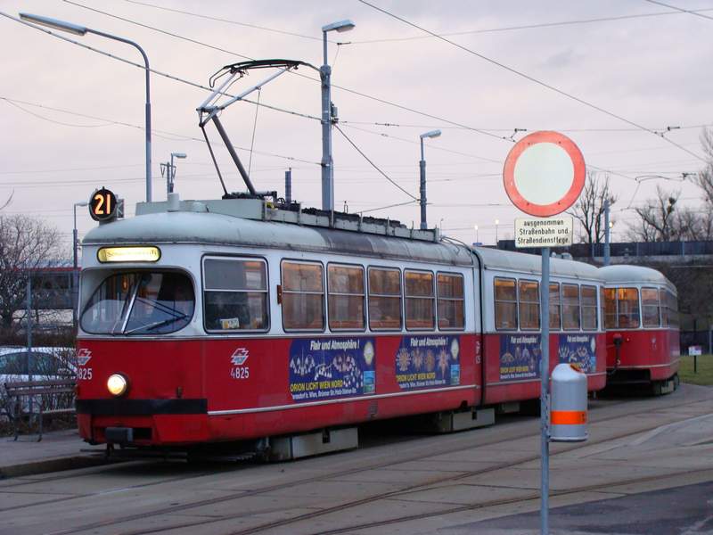 Schlüsselwörter: Linie21, 21, 4825, E1, TypeE1, Type-E1, Praterkai, Endstelle, Endstation, Schleife, Straßenbahn, Hochflur, Strab, WiLi, WienerLinien